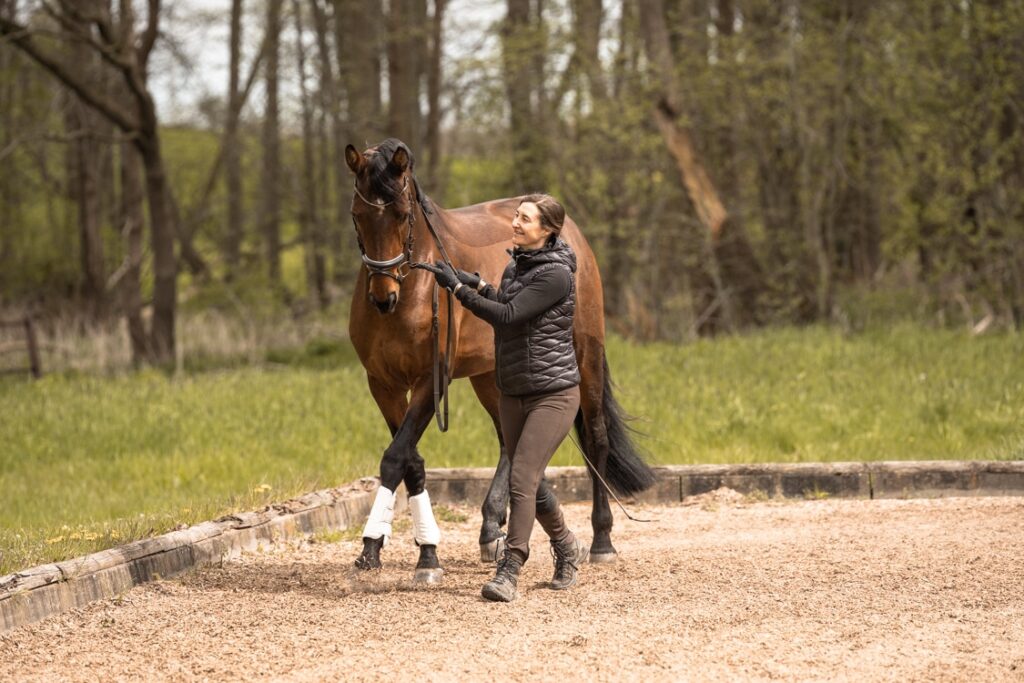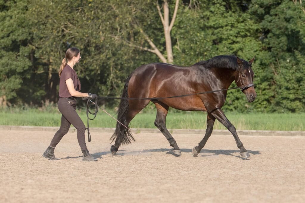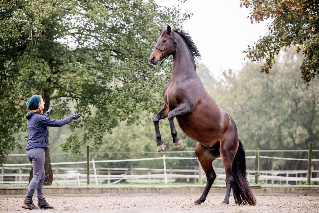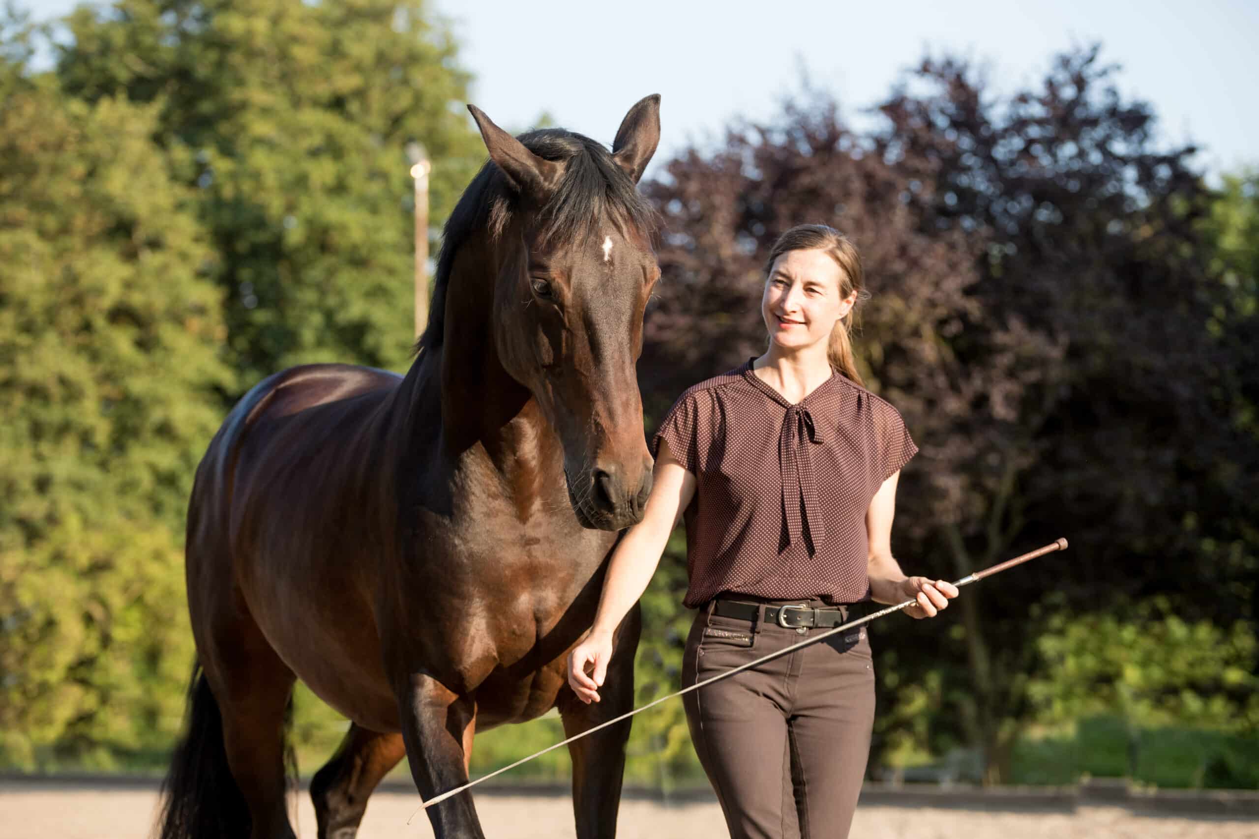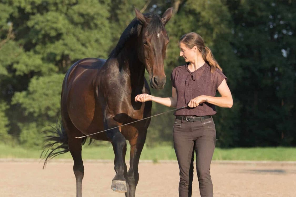 Unabhängig davon mit welchem Equipment ich arbeite: Oberste Priorität ist das vertrauens- und respektvolle Miteinander. Über die Körpersprache gehe ich in einen Dialog mit dem Pferd und erkläre davon ausgehend meine Hilfen. Im Zentrum steht dabei, eine tragfähige Kommunikation zum Pferd aufzubauen, in der auch Missverständnisse und Schwierigkeiten positiv aufgelöst werden können. Aus diesem Verständnis und Vertrauen kann ich dem Pferd mehr und mehr erklären, seinen Körper gesunderhaltend zu benutzen, besser in sein Gleichgewicht zu finden und sich gerade zu richten. Dabei lege ich großen Wert darauf, eine Verbindung zum Reiten zu schaffen. Die Bodenarbeit soll helfen, dass das Pferd uns auch vom Sattel aus besser verstehen kann.