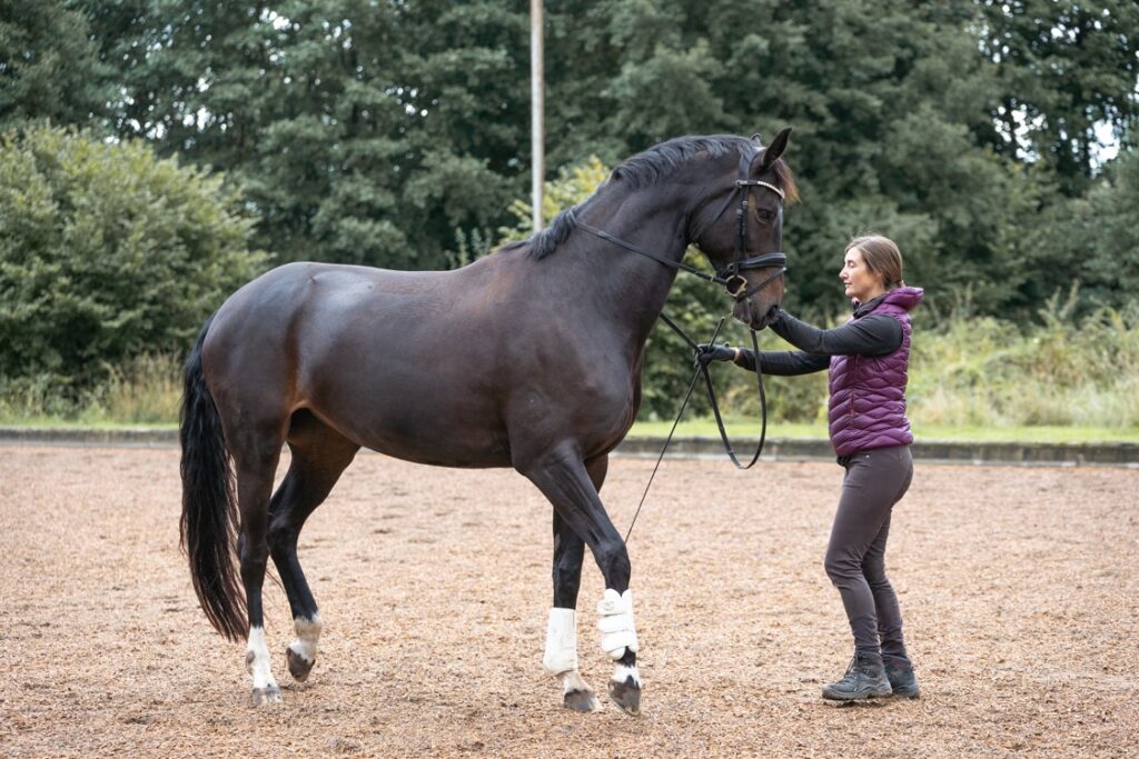 Ganz konkret mache ich mir im Training ein Bild von der aktuellen körperlichen und mentalen Situation des Pferdes. Ich analysiere den Trainingszustand des Pferdes, vor allem die muskuläre Entwicklung und fasziale Dysbalancen, daraus folgend die Bewegungsmuster sowie Koordination und Beweglichkeit. Zum anderen interessiert mich die mentale Situation: Ist das Pferd motiviert, konzentriert, ängstlich? Auf diesen Erkenntnissen aufbauend gestalte ich das Training vom Boden je nach Zielstellung unterschiedlich: Manche Themen lassen sich in der Freiarbeit gut bearbeiten, für andere nutze ich Übungen am Kappzaum, wiederum andere Akzente setze ich mit der Arbeit am Kurzzügel.